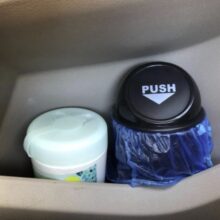 Made from non-toxic ABS plastic, our little trash bin mimics the look of large, full-sized trash cans, with a “PUSH” logo at the lid opening. The can fits right into a standard-sized cup holder for a trash bin for snack wrappers right within your reach. The can measures 7.9 x 2.7 inches (L x W).